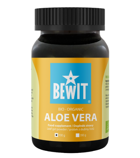 Doplněk stravy Bewit Aloe Vera BIO 100 g - Aloe vera je pro své účinky známa a používána již po tisíce let. Název aloe pochází z arabského slova alloeh, které je překládáno jako „hořká a lesklá látka“. Termín vera pochází z latinského slova „pravda“. Už z názvu je zřejmé, že aloe není jen tak nějakou obyčejnou rostlinou. Aloe vera má masité listy plné šťavnaté dužiny (gelu), který se suší na výsledný prášek. Vysušený gel obsahuje mnoho důležitých látek. Vhodné do vody, džusů, mléka, ovesných kaší, smoothie, cereálií nebo jiných pokrmů.