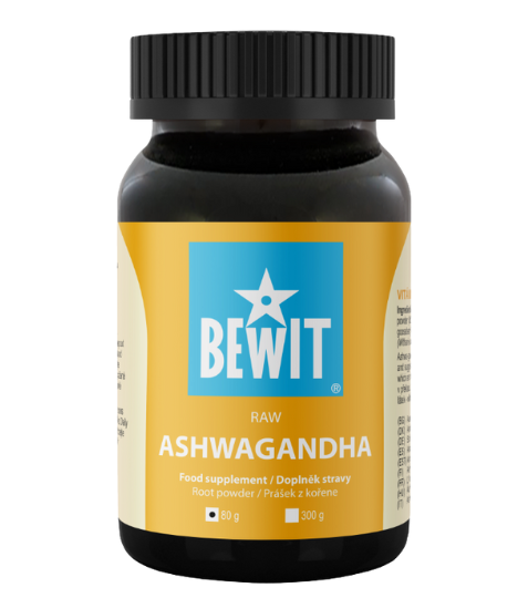 Doplněk stravy Bewit Ashwagandha RAW 80 g - Ašva-ganda v překladu znamená „koňská síla“ a poukazuje na obsah látek – withanolidy, které obsahuje kořen rostliny. Vhodné do vody, džusů, mléka, ovesných kaší, smoothie, cereálií nebo jiných pokrmů.