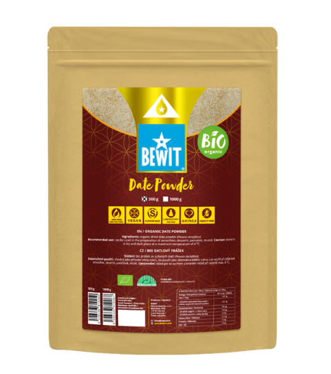 Doplněk stravy Bewit Datlový prášek BIO 300 g - představujeme vám náš datlový prášek, vyrobený z BIO datlí. Má příjemně sladkou chuť a aroma po čerstvých datlích. Disponuje mimořádně vysokým obsahem vlákniny. Navýší nutriční hodnotu vašich jídel. Kouzlit s ním můžete ve sladké, slané, studené i teplé kuchyni.