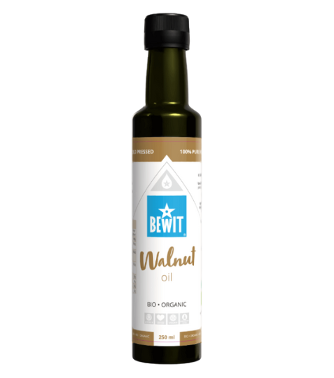 Doplněk stravy Bewit Olej z vlašských ořechů, BIO 250 ml - jemný, nasládlý, příjemně oříškový – takový je za studena lisovaný olej z vlašských ořechů. Výborný je do snídaňových kaší, salátů a luštěninových pomazánek, kterým dodává úplně jiný rozměr. Tradičně je přidáván i do mnoha studených pokrmů orientální kuchyně.