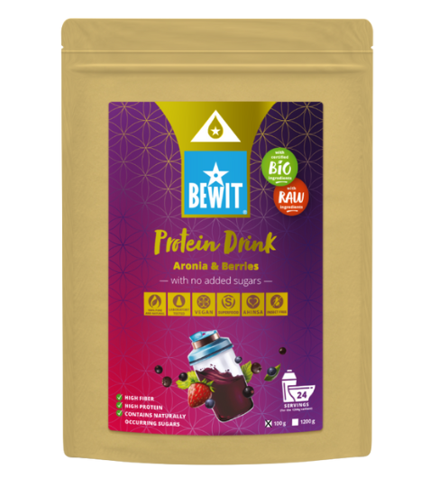 Doplněk stravy Bewit Proteinový nápoj, aronie s černým rybízem, borůvkou a jahodou, se stévií, BIO 100 g - náš mimořádně výživný proteinový nápoj je vyladěný do posledního detailu. Obsahuje BIO certifikované suroviny v té nejvyšší možné kvalitě. Spolehlivě zasytí, dodá sílu a nezatíží žaludek. Příprava je rychlá a snadná. Postačí vám jen šejkr a studená voda. Oceníte jej po ránu, po sportu i na cestách, jednoduše kdykoliv a kdekoliv.