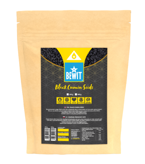 Doplněk stravy Bewit Semínka černuchy seté (černý kmín) 250 g - vysoce výživná semínka černuchy seté disponují poměrně výraznou a pikantní chutí, pro kterou výborně dochutí zeleninové saláty, omáčky a polévky. V indické kuchyni se bez nich neobejdete.