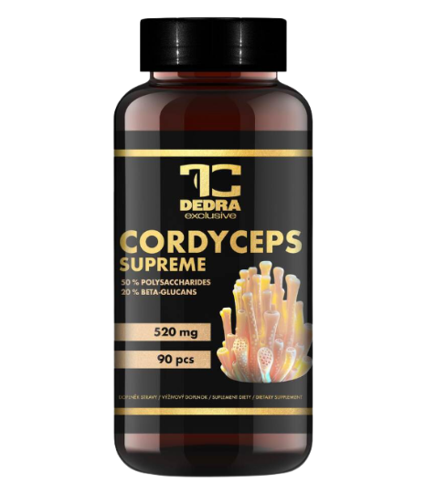 Doplněk stravy. Cordyceps Supreme 520 mg je vitální houba tradičně užívaná v čínské medicíně pro energii, zdraví a imunitu. Obsahuje 50 % polysacharidů a 20 % beta-glukanů, cenné vitaminy, minerály a stopové prvky. 90 kapslí, bez konzervantů a umělých přísad, vhodné pro vegany.