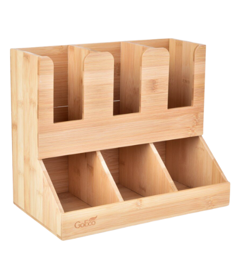 I když je primárně určen pro čaje a kapsle, jeho přihrádky lze využít i pro drobnosti typu dochucovadla v sáčcích, cukr nebo bambusová napichovátka.