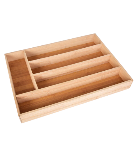 Bambusový příborník do zásuvky se 5 přihrádkami o rozměru 28 × 38,5 cm. Zajistí přehledné uložení příborů a elegantní pořádek ve vaší kuchyňské zásuvce.