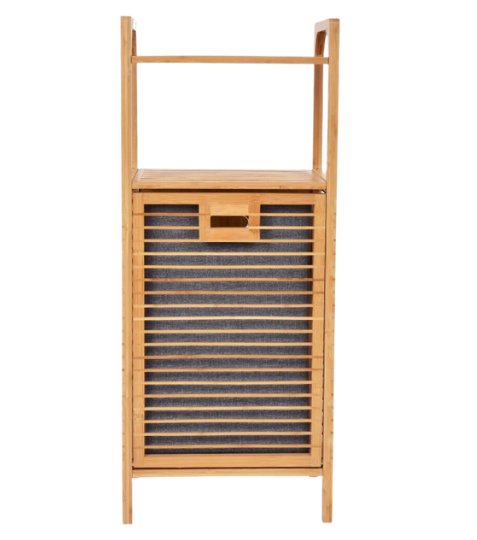 Bambusový regál GoEco (95 cm) s výklopným košem na prádlo a dvěma horními policemi je ideální do koupelny či prádelny. Umožňuje elegantní třídění prádla a přehledné uložení ručníků a kosmetiky. Vyroben z vysokotlakého bambusu – odolný, ekologický, stylový.