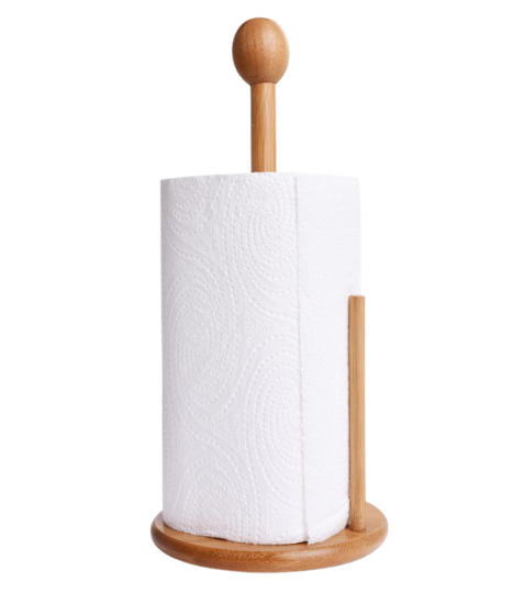 Ekologický bambusový stojan GoEco (⌀16 × 34 cm) na papírové utěrky s praktickou zarážkou zabraňující nežádoucímu rozmotání. Vyroben z rychlerostoucího bambusu – antibakteriální, odolný a stylový doplněk každé kuchyně.