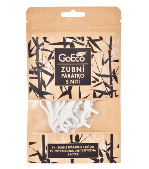 Kompostovatelná párátka s dentální nití GoEco – 30 ks v balení. Vyrobená z kukuřice (PLA), 100% ekologická a biologicky rozložitelná. Snadno se používají a usnadňují čištění mezizubních prostor i lidem, kterým nevyhovuje klasická nit.