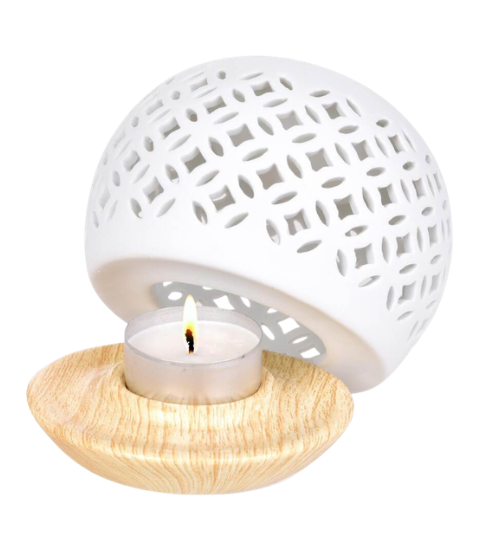 Keramická aromalampa LIGNIA v matné bílé s kulovitým tvarem a geometrickým krajkovým dekorem. Stylový podstavec v imitaci dřeva dodává přírodní nádech. Pro vosky a esence. Elegantní a funkční doplněk do interiéru, ideální pro aromaterapii a vytváření útulné atmosféry doma. Hodí se do různých stylů interiérů, od moderních po klasické. Nejen praktický nástroj pro rozprašování vůní, ale také krásná dekorace.