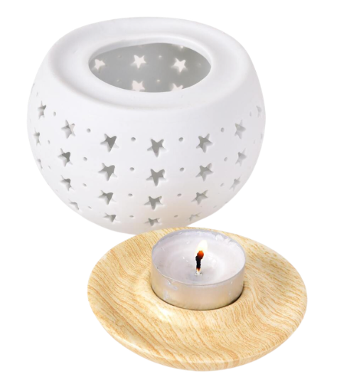 Hvězdný dekor (Starry Design): Tělo aromalampy je prořezáváno jemnými otvory ve tvaru hvězd a teček. Po zapálení čajové svíčky se tyto vzory promítají na okolní stěny a vytvářejí kouzelnou atmosféru připomínající noční oblohu.