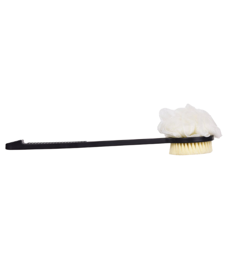 SPA 2v1 kartáč + puff na mytí zad s dlouhou rukojetí 37 cm v černé barvě. Oboustranný – kartáč pro masáž a peeling, jemný puff pro bohatou pěnu. Praktický doplněk pro každodenní hygienu.