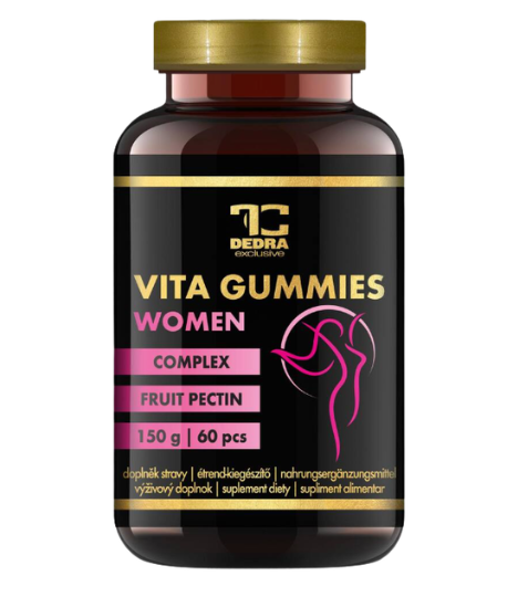 Doplněk stravy. VITA GUMMIES WOMAN jsou ovocní želé medvídci s vitaminy a minerály pro ženy. Lahodná tropická chuť, čisté složení bez barviv a konzervantů. Obsahují vitaminy A, D, E, B6, B12, biotin, zinek a železo pro podporu imunity, energie, pokožky i vlasů. Chutná a zdravá denní dávka vitality.