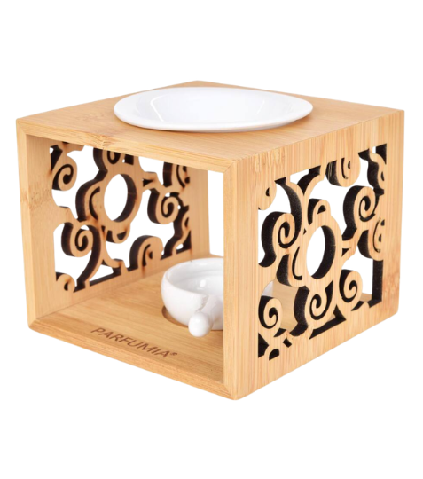 Designová aromalampa ZENARA z bambusového dřeva s bílou keramickou miskou na vosky a esence. Minimalistický styl, čisté linie, přirozené materiály. Doporučujeme kombinovat s vonnými esencemi a vosky PARFUMIA. Elegantní a funkční doplněk do interiéru, ideální pro aromaterapii a vytváření útulné atmosféry doma. Bambusový stojan dodává přirozený půvab a stabilitu, harmonicky spojuje estetiku s funkčností. Hodí se do různých stylů interiérů, od moderních po klasické. Nejen praktický nástroj pro rozprašování vůní, ale také krásná dekorace.