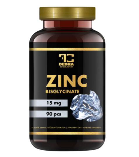 - bisglycinát zinečnatý je chelátová forma zinku, kde je zinek navázán na dvě molekuly aminokyseliny glycinu. Tato vazba chrání zinek před interakcemi s látkami, které mohou snižovat jeho vstřebávání, a umožňuje jeho efektivní absorpci v tenkém střevě