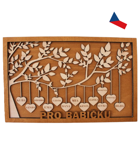 Tato dřevěná dekorace „Strom života“ je univerzální a ideální pro všechny, kdo chtějí obdarovat své blízké osobním a stylovým dárkem. Je vhodná nejen jako dárek pro babičku, ale také pro maminku, dědečka, rodiče, nebo jiného výjimečného člena rodiny. Díky možnosti zvolit si vlastní text (např. "Pro maminku", "Pro rodinu" nebo jakýkoliv jiný nápis) se stává tato dekorace skutečně jedinečnou.Strom symbolizuje rodinné pouto a každý list a srdíčko s vygravírovanými jmény členů rodiny přináší do interiéru přírodní a vřelou atmosféru. Dřevěný „Strom života“ je výjimečným dárkem, který bude krásnou vzpomínkou na společné chvíle. S možností přizpůsobit text na míru je vhodný jako dárek pro každou příležitost – ať už jde o narozeniny, výročí, nebo Vánoce.