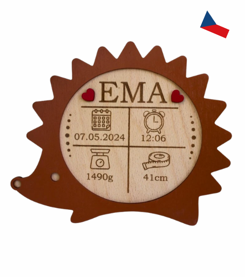 Dřevěný ježek s personalizovanými údaji o narození miminka je dekorací, která má nejen hravou podobu, ale i velkou citovou hodnotu. Gravírujeme jméno, datum a čas narození, váhu i délku dítěte, takže každý kousek je naprosto jedinečný. Díky kvalitnímu dřevu a preciznímu zpracování vydrží jako krásná vzpomínka po mnoho let.