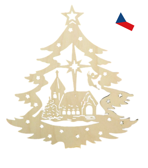 Dřevěná Vánoční dekorace s motivem stromku a kapličky.