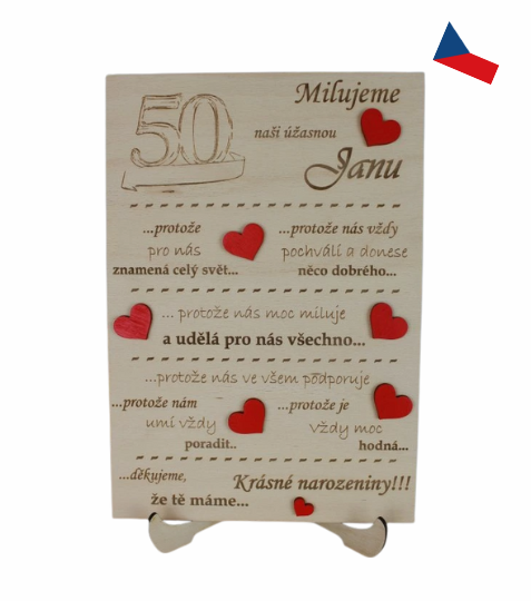 Každý text je gravírovaný do přírodní překližky, doplněný červenými srdíčky a stojánkem. Přáníčko může stát na poličce klidně celý rok – a připomínat, jak moc pro nás oslavovaná osoba znamená.