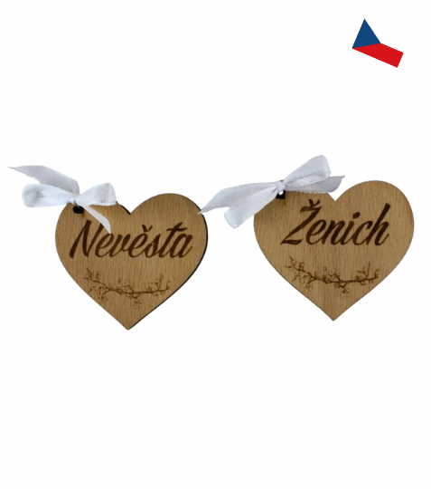 Dřevěné jmenovky ve tvaru srdce s jemným gravírováním jsou krásným doplňkem ke svatební výzdobě i praktickým řešením, jak stylově označit ženicha, nevěstu nebo jednotlivé hosty. Každá jmenovka má otvor a je doplněna bílou stužkou, díky které ji snadno přivážete k židli, skleničce, dárku. výslužce, nebo ji lze jen položit na svatební tabuli.