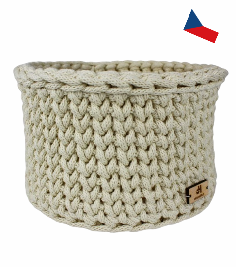 Dřevěné dno zajišťuje pevnost a stabilitu, zatímco háčkované stěny z kvalitní příze vytvářejí příjemnou texturu a hřejivý vzhled.
