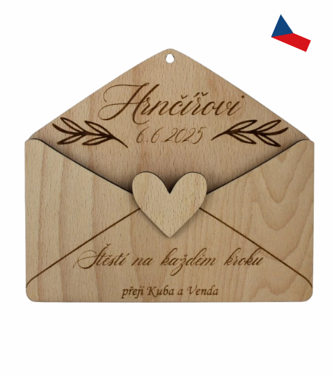 Tahleta „obálka“ se nikdy neztratí. Je vyrobená z kvalitního dřeva a místo papíru nese vygravírovaný vzkaz, jména i datum, které Vám připomene jeden z nejhezčích okamžiků. Uprostřed je dřevěné srdíčko a nechybí ani otvor pro zavěšení nebo ozdobení stuhou – můžete ji vystavit na stěnu nebo postavit na poličku.