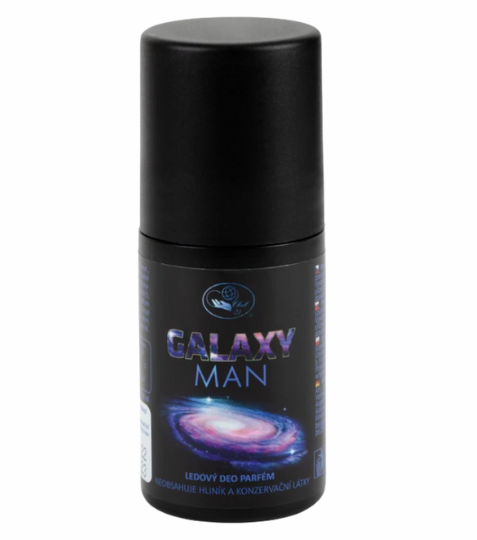 Ledový deo parfém Galaxy man bez konzervačních látek. Neobsahuje hliník. Zabraňuje rozkládání potu a vytváření nepříjemného zápachu. Skupina vůně: sladká, mořská, dřevitá, moušusová, citron, bergamot, mořské tóny Pačule, cedrové dřevo, vanilka, ambra.