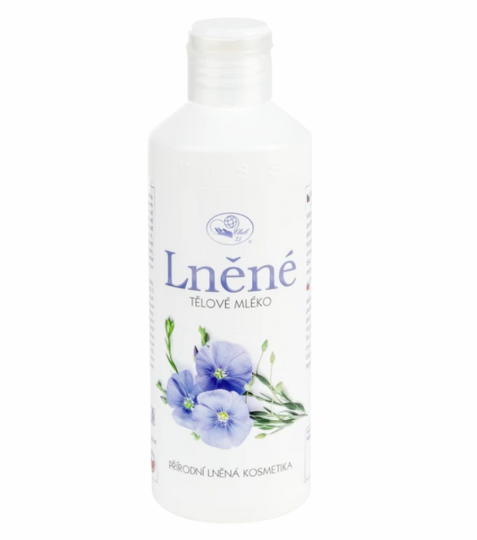 Lněné tělové mléko - jemná emulze s obsahem panenského lněného oleje výrazně hydratuje a zjemňuje pokožku těla. Dobře se roztírá, rychle se vstřebává, obsahuje 99,75 % přírodních látek a je jemně parfemováno. Lněný olej je známý pro své regenerační, zvláčňující a zjemňující účinky. Podporuje léčbu ekzematických stavů pleti, lupénky a popálenin. Je vhodný k ošetření ztvrdlé a popraskané kůže. Chrání pokožku před volnými radikály, poškozujícími tkáň během zánětlivých stavů pleti. Je velmi účinnou regenerační složkou. Pravidelná aplikace činí pokožku vláčnou a jemnou.