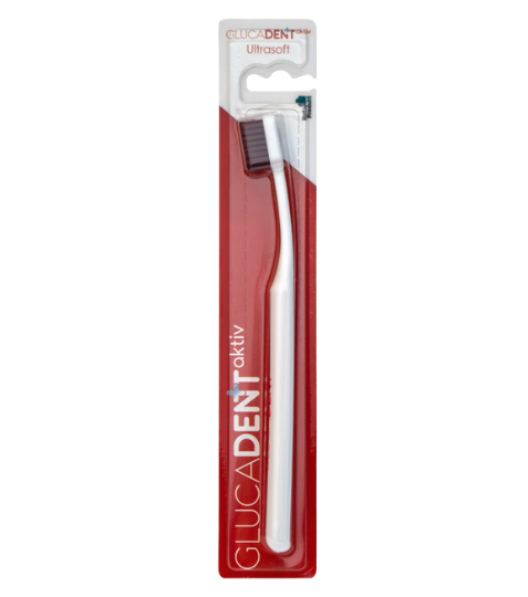 Zubní kartáček Glucadent aktiv extra měkký má tuhé prohnuté držadlo, které umožňuje snadné a příjemné držení ve všech polohách. Dlouhý prohnutý krček kartáčku zajišťuje snadný dosah na všechny partie chrupu, zejména pak na zadní zuby. Hlava kartáčku je velmi hustě osazena vysoce kvalitními jemnými vlákny se zaoblenými konci. Tato vlákna účinně odstraňují zubní plak a jsou šetrná k dásním. Kartáček Glucadent aktiv s vlákny ULTRASOFT (více než 4700 vláken) je velmi jemný a vhodný pro citlivé dásně.