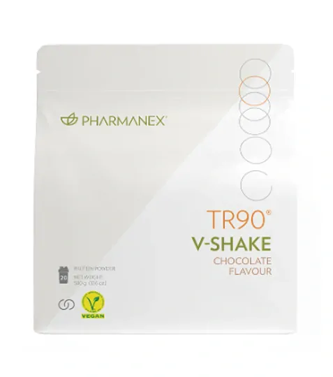 TR90 V-Shake – čokoládový 500 g hrachový proteinový prášek (61 %), proteinový prášek z hnědého rýže (31 %), kakaový prášek se sníženým obsahem tuku, přírodní aroma, sladidlo: steviol-glykosidy obsah bílkovin 80 %