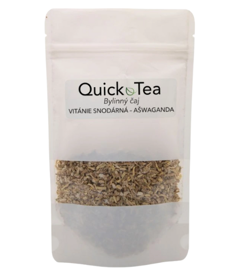 Doplněk stravy QuickTea Vitánie snodárná – Ašvaganda 30 g. Ašwaganda je bylina s dlouhou historií použití v ajurvédské medicíně, kde se její kořen využívá pro své revitalizační účinky. Ašwaganda je ceněná pro své adaptogenní vlastnosti, které pomáhají organismu vyrovnat se se stresem a podporují duševní a fyzickou vitalitu. Kořen této rostliny může přispět k zlepšení kvality spánku, podpoře duševní rovnováhy a posílení imunity.