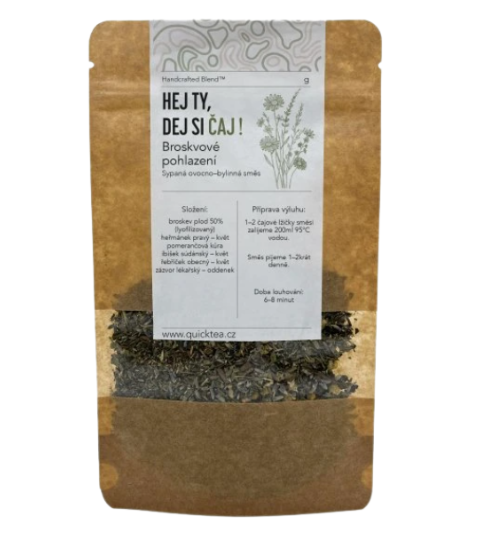Broskvové pohlazení je směs, která spojuje sladkost broskve s jemným heřmánkem a pomerančovou kůrou. Osvěžující zázvor dodává lehce hřejivý tón, zatímco ibišek a řebříček přinášejí vyváženou bylinnou notu a krásnou barvu nálevu.