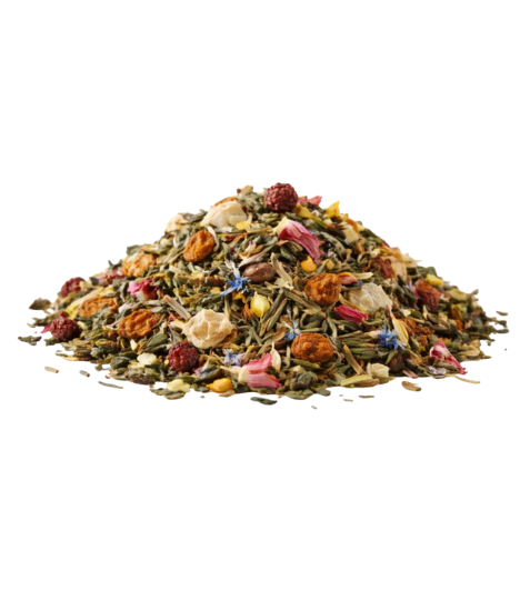 Čajová harmonie krásy & vitality – směs je vyvážená směs černého a zeleného čaje, yerby maté, bylinek a ovoce s jemnou chutí hrušky a broskve. Nabízí povzbuzení, svěžest i špetku luxusu – každý den. Směs je navržena pro přirozené povzbuzení a svěžest během dne – skvěle funguje teplá i jako letní ice tea.
