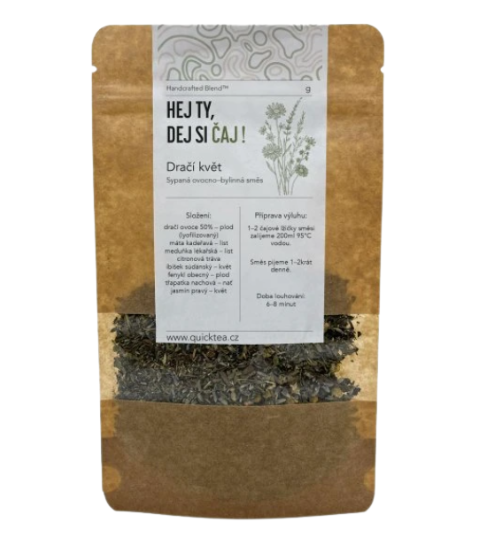 Dračí květ je čaj plný barev, vůní a exotických tónů. Dračí ovoce tvoří sladký ovocný základ, který se mísí s citronovou trávou a mátou do svěžího nádechu. Jasmín a třapatka přinášejí jemnost a harmonii, zatímco fenykl a meduňka dodávají lehkost a klid.