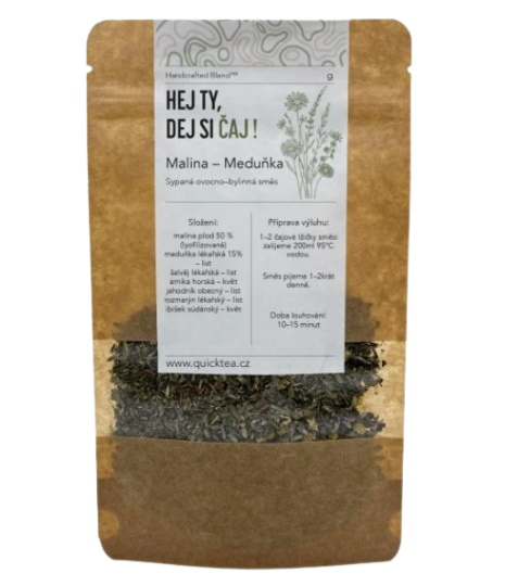 Doplněk stravy QuickTea Malina – Meduňka 30 g. Náš ovocno-bylinný čaj je kvalitní čaj obsahující plody Maliny a bylinky. Maliny jsou v čaji v poměru 50% vůči bylinkám, jedná se tak o intenzivní malinový čaj. Maliny v čaji jsou v lyofilizované formě, v jediné formě, která umožňuje silné uchovávání chuti a čerstvosti samotných malin. Dochází tak k získání intenzivní chuti čaje přírodní formou, v čaji totiž nenaleznete žádná umělá dochucovadla, cukry či konzervanty. Dále v čaji naleznete bylinky jako jsou Meduňka či Šalvěj, které dokonale podtrhují chuť a intenzitu čaje. Samotný čaj obsahuje výhradně kvalitní bylinky.