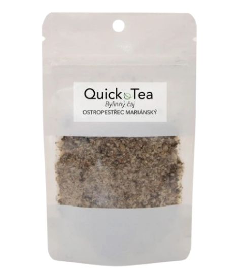 Doplněk stravy QuickTea Ostropestřec Mariánský 30 g. Ostropestřec mariánský je byliná rostlina, jejíž semena jsou ceněna pro své zdraví prospěšné účinky. Je známý především pro své pozitivní vlivy na funkci jater. Aktivní složka silymarin obsažená v semenech ostropestřce má silné antioxidační vlastnosti, které pomáhají chránit jaterní buňky před oxidačním stresem a toxiny. Ostropestřec může podporovat detoxikační procesy v játrech a přispívat k jejich regeneraci.