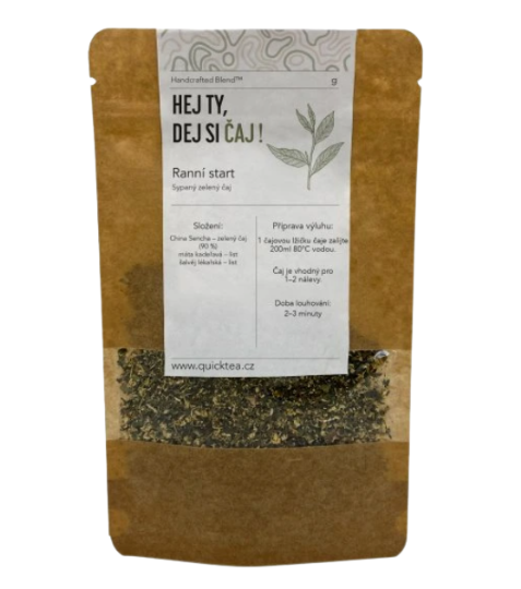 Zelený čaj Ranní start jsme vytvořili pro chvíle, kdy potřebujete jemné, ale jasné probuzení. Základ tvoří China Sencha – svěží a lehce travnatá – doplněná o mátu a šalvěj, které dodávají čaji čistý a osvěžující charakter.