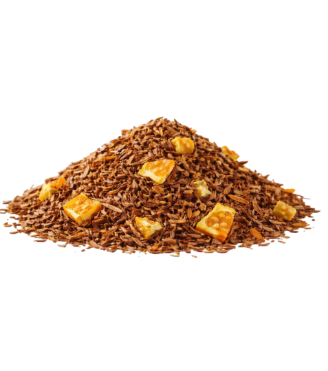 Červený rooibos pochází z listů keře Aspalathus linearis, rostoucího pouze v oblasti Cederberg v Jihoafrické republice. Díky lehké oxidaci má sytou červenou barvu, jemně ořechové aroma a nasládlou chuť. V této směsi je rooibos obohacen o přírodní pomerančové aroma, marakujový koncentrát a kousky ovoce, což mu dodává exotický a osvěžující charakter.