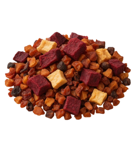 Rubínová zahrada – ovocný čaj je voňavý ovocný čaj, který si zamilují děti, rodiče i prarodiče. V jeho základu stojí červená řepa, jahody, jablka a mrkev, které společně vytvářejí lahodnou rovnováhu sladkosti, ovocnosti a jemné zemité chuti.