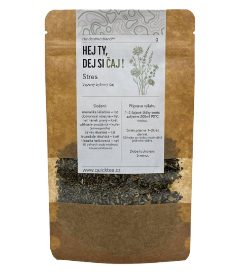 Bylinný čaj Stres je směs pro chvíle, kdy potřebujete zvolnit, uvolnit napětí a zklidnit mysl. Levandule lékařská pomáhá k relaxaci a zdravému spánku, třezalka tečkovaná podporuje duševní pohodu a emoční rovnováhu a meduňka přispívá k relaxaci a klidnějšímu usínání. Jemná bylinná chuť se hodí i místo večerní kávy.