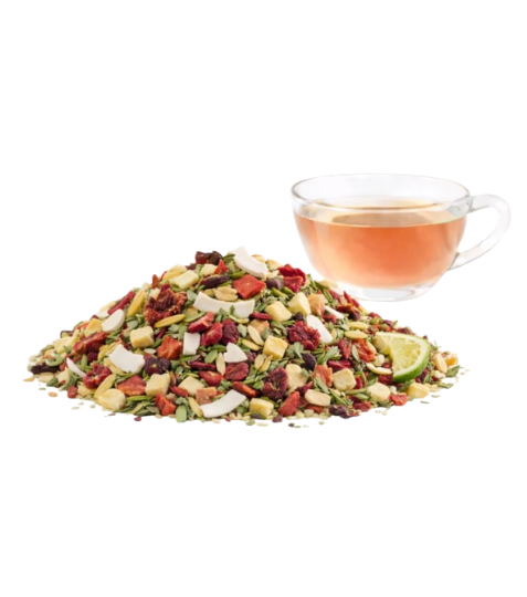 Kokosové chipsy přinášejí jemnou krémovost, kterou vyvažuje svěžest limetky a ibišku. Kousky jablek dodávají přirozenou ovocnost, moringa lehký zelený tón a stévie se postará o přirozenou sladkost bez cukru.