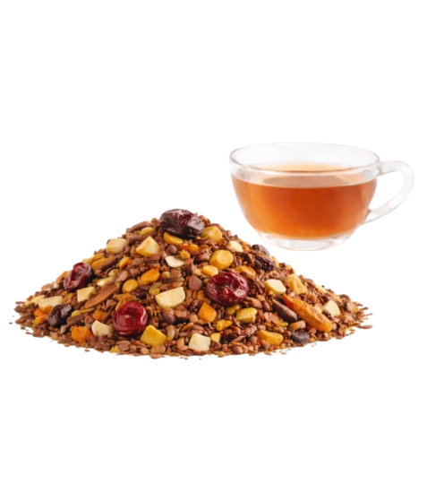 Zimní kouzlo je rooibosová směs navržená pro chladné dny, kdy přijde vhod něco jemného, sladkého a zahřívajícího. Základ tvoří červený rooibos, který je přirozeně bez kofeinu a velmi příjemný na pití.