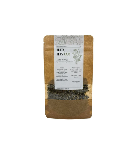 Zlaté mango je čaj plný slunce, energie a radosti. Sladká chuť lyofilizovaného manga se spojuje s ibiškem a bezem do ovocného základu, zatímco rozmarýn a eukalyptus přinášejí lehký, osvěžující tón. Meduňka pak čaj zjemňuje a vyvažuje do příjemné harmonie.